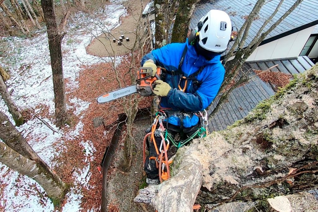 高所や狭い場所、大きな樹木など、通常の伐採が難しいケースでも、